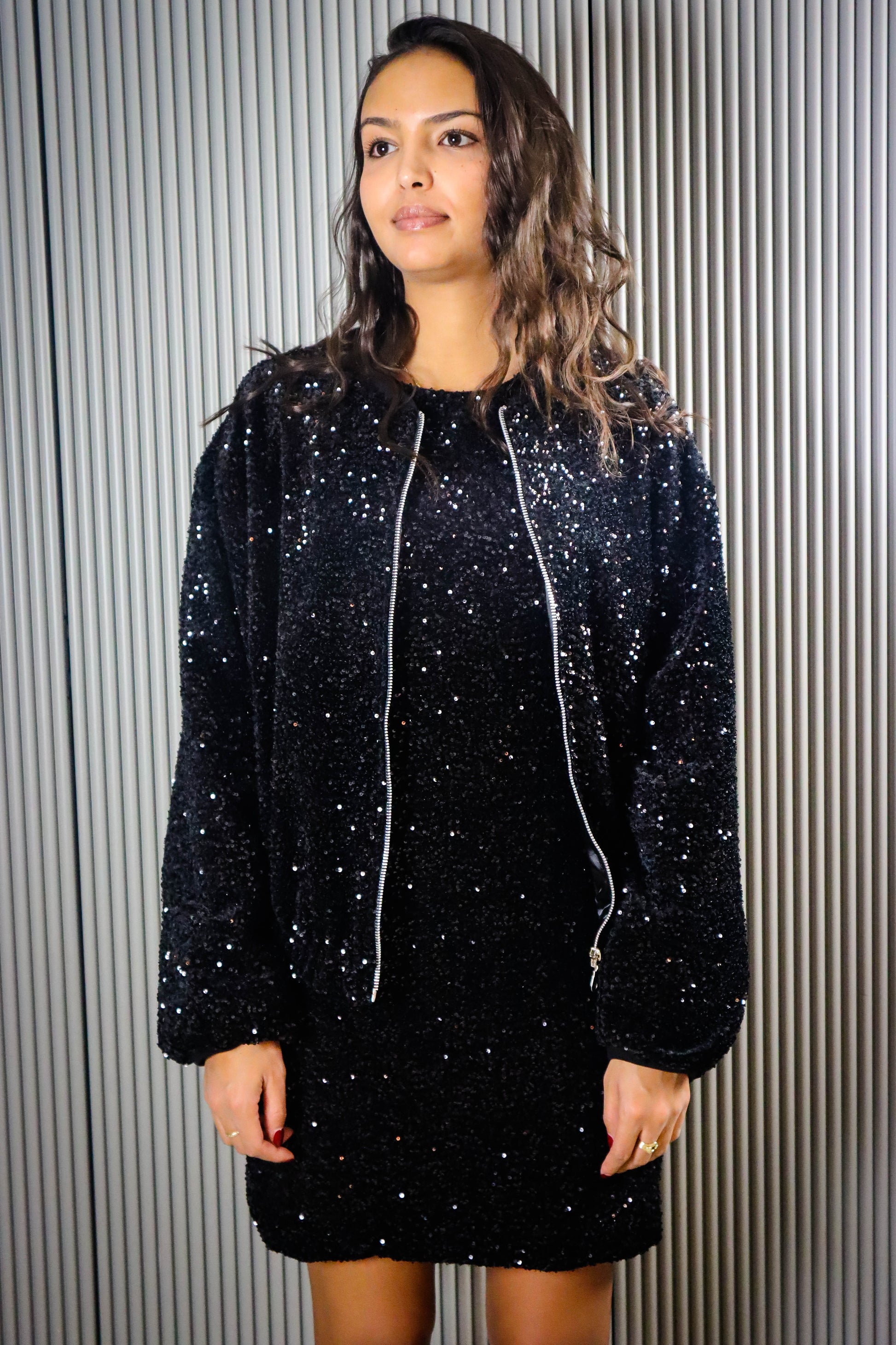 DESCRIZIONE: Abito corto in paillettes con manica a palloncino