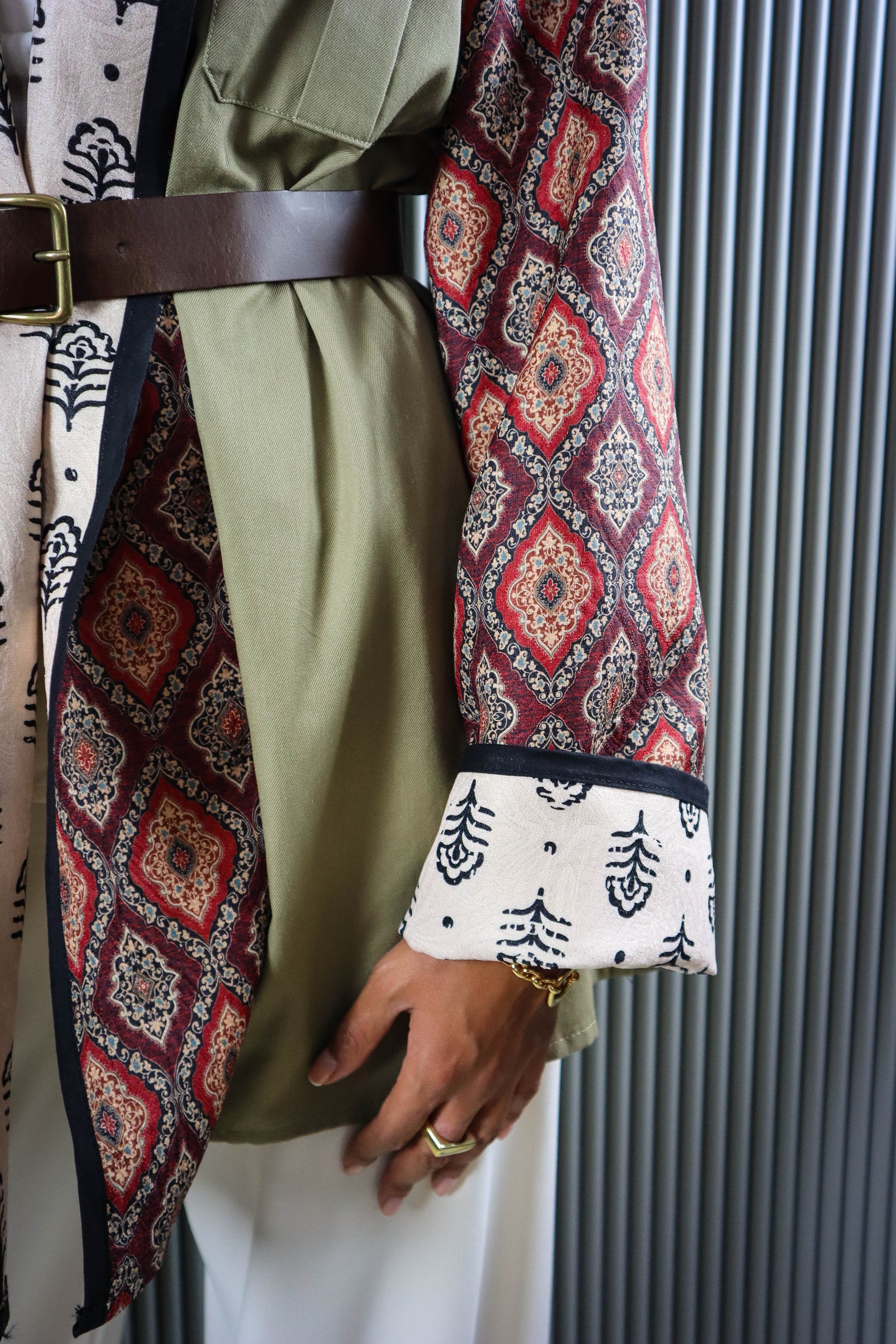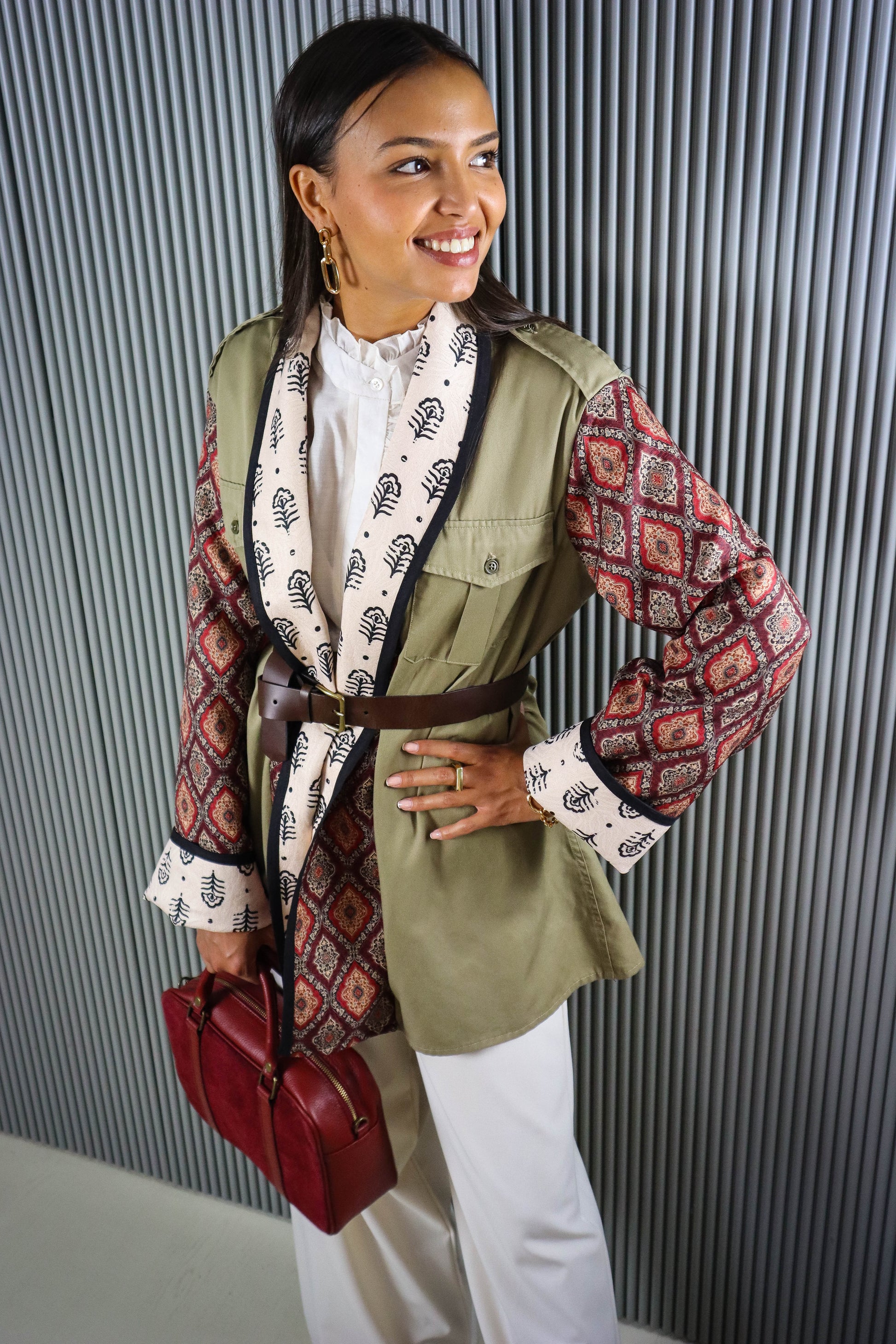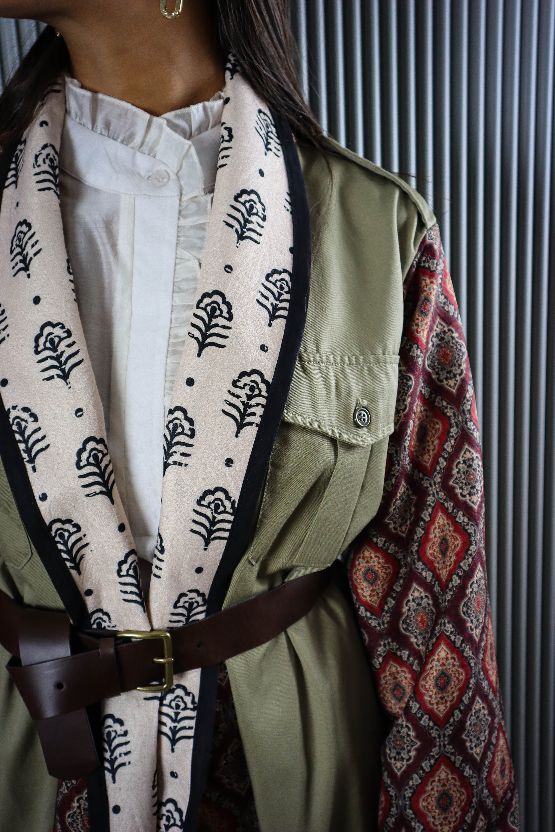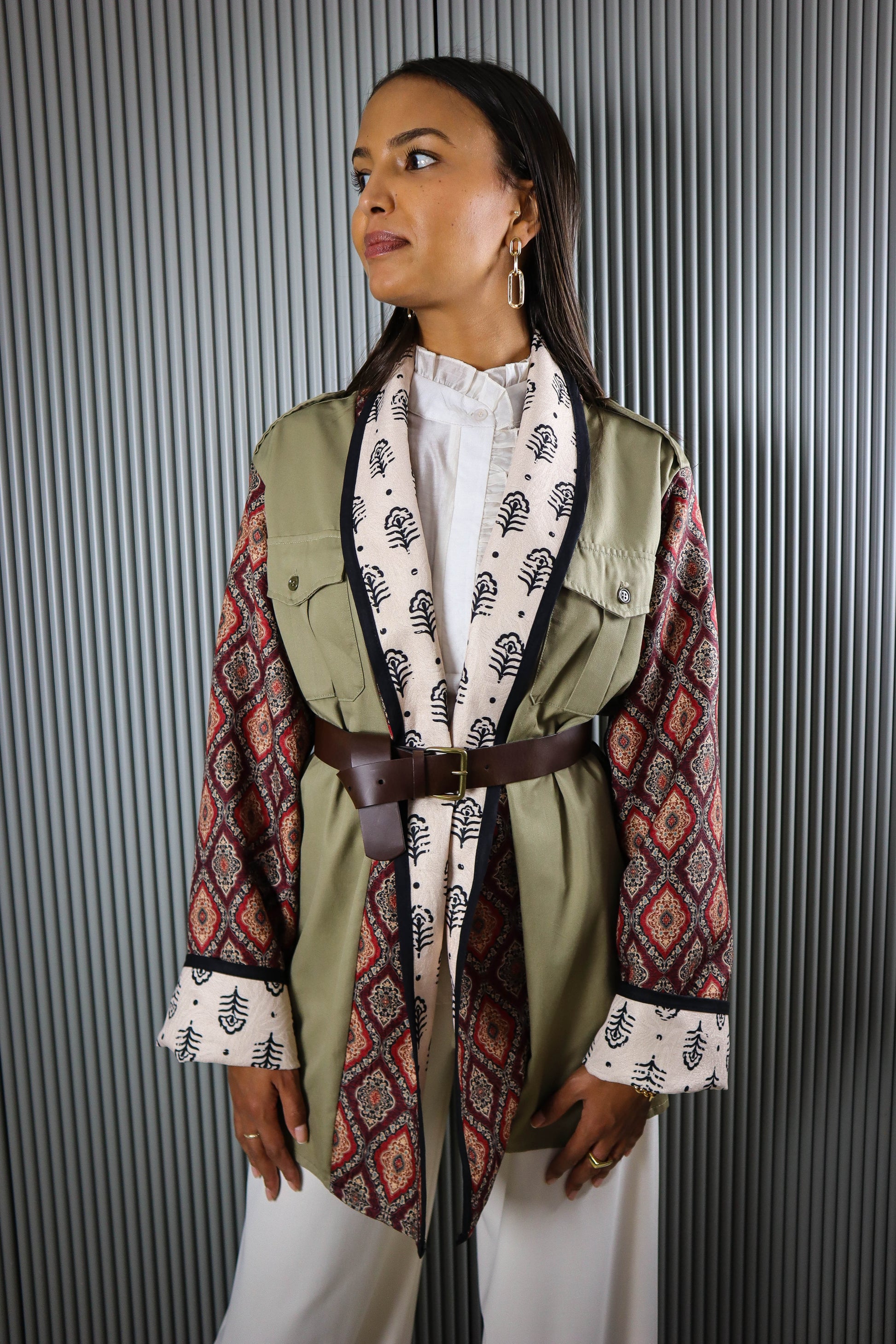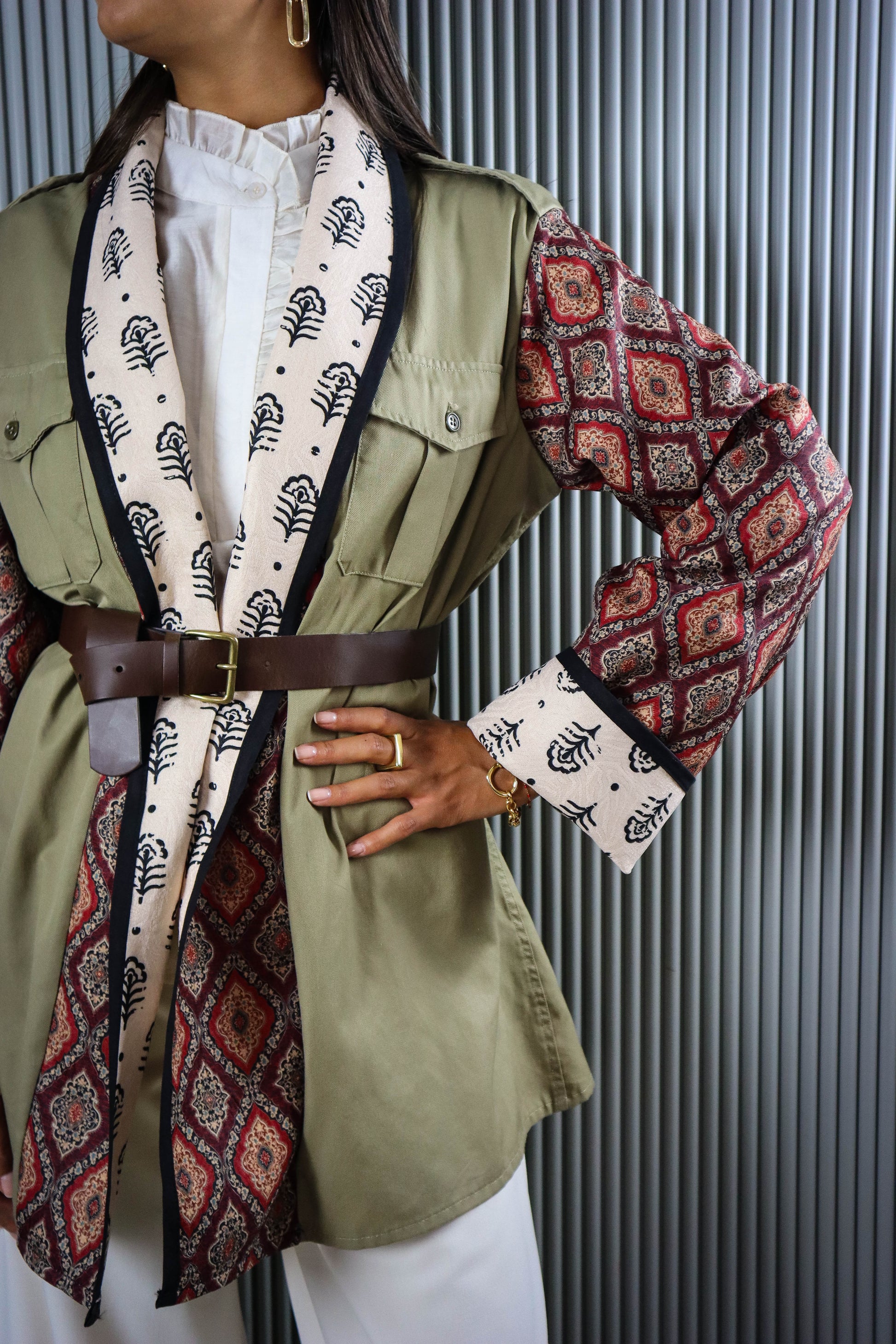 DESCRIZIONE: Giacca vintage con cintura realizzata con tessuti riciclati lavorati e tagliati a mano.