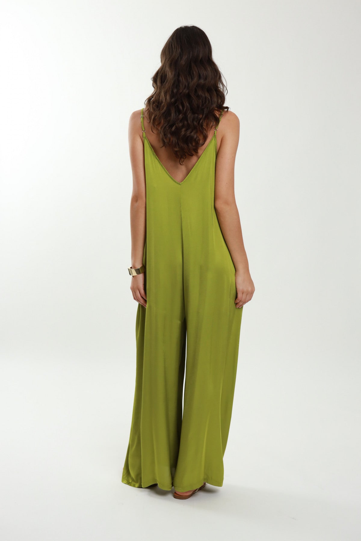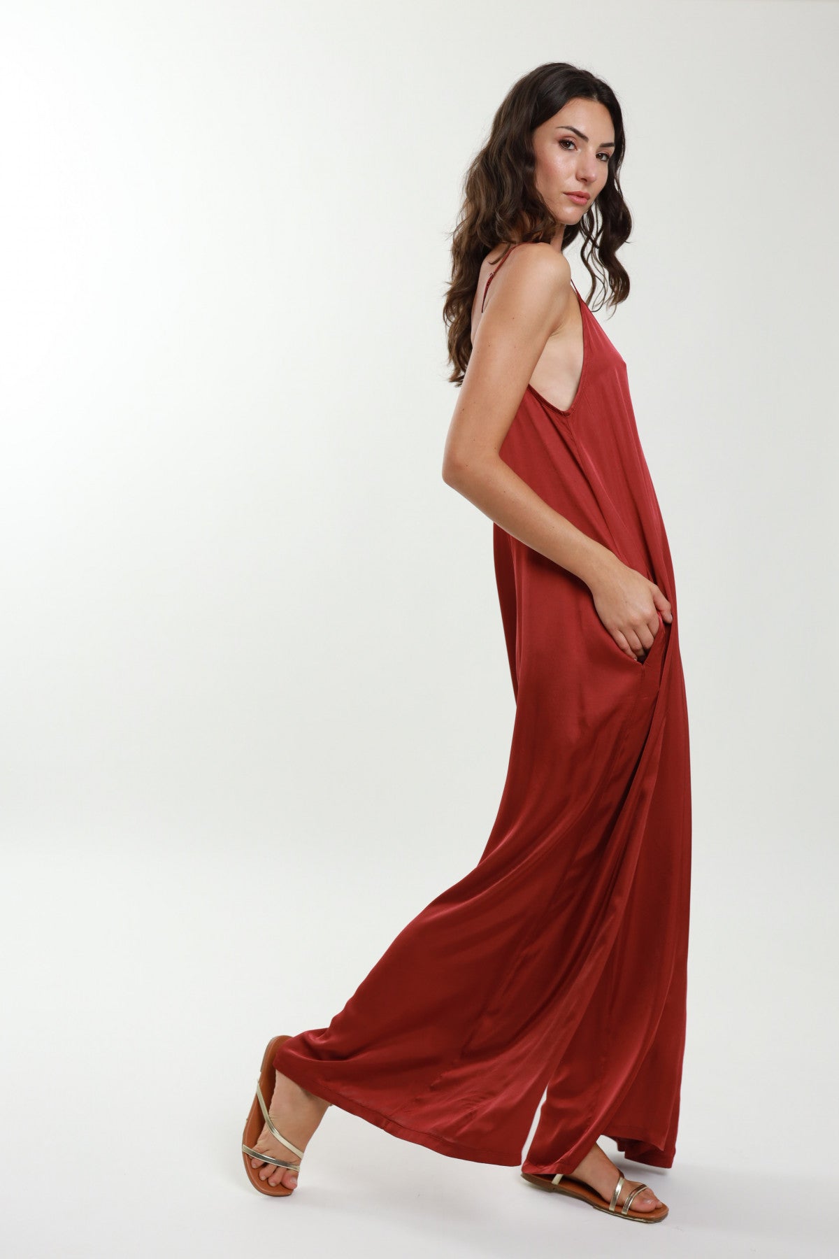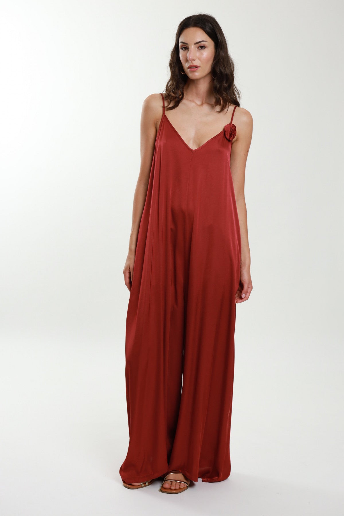 DESCRIZIONE: Tuta Over Fit in Raso di Viscosa con Tasche e Fiore Applicato Sulla Spallina.