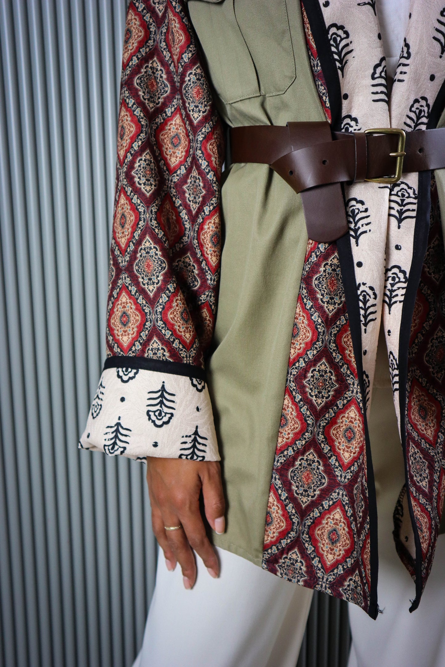 DESCRIZIONE: Giacca vintage con cintura realizzata con tessuti riciclati lavorati e tagliati a mano.