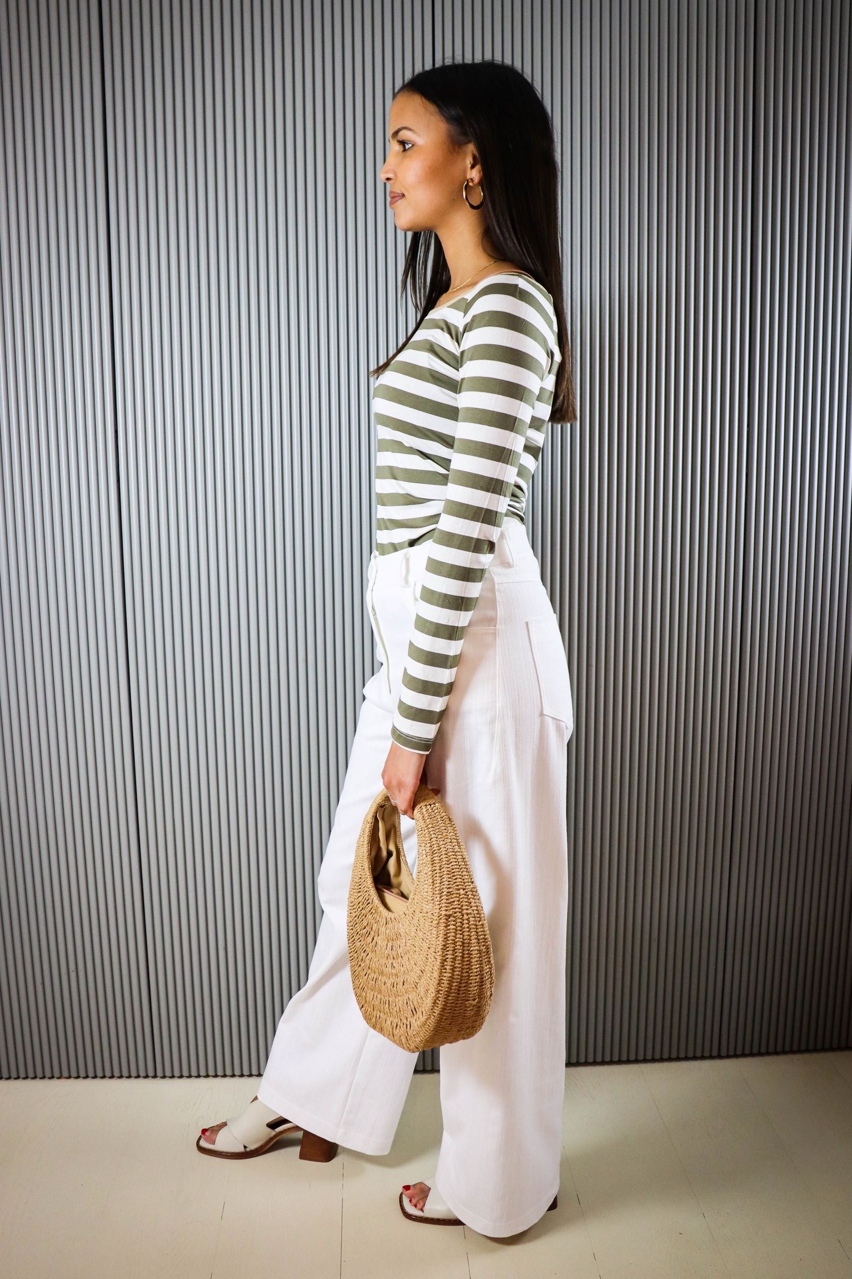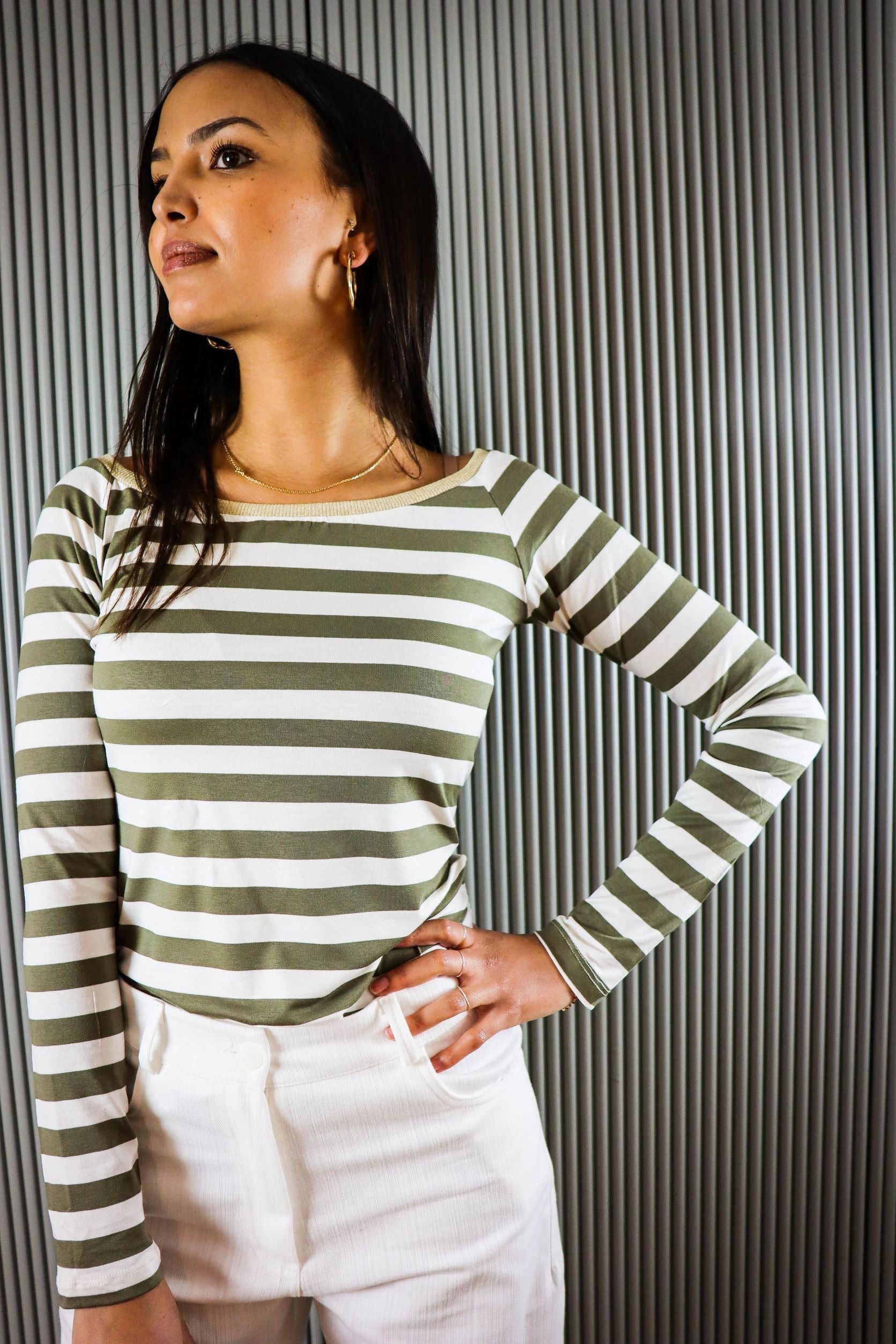 DESCRIZIONE: Maglia Barchetta a Manica Lunga Realizzata in viscosa con vestibilità regular. Dettaglio di fantasia rigata e collo in Lurex